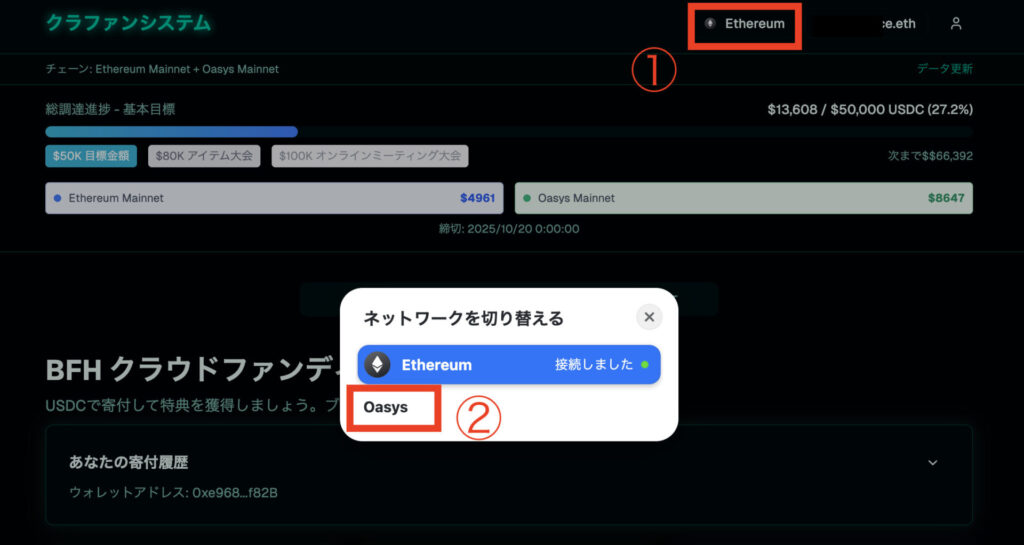 OasysのUSDC.eで寄付する方は以下の①②の順に押して、ネットワークを切り替えましょう