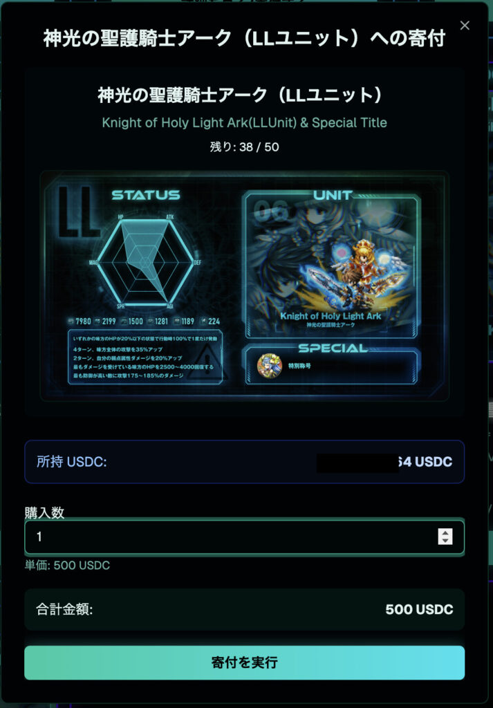 購入数が1になってることを確認して、「寄付を実行」ボタンを押す!