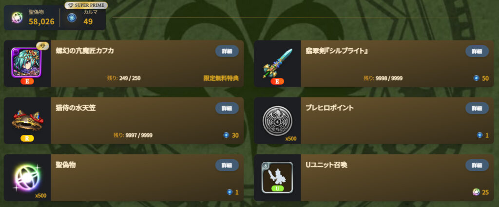 スーパープライムの特典として、毎日ログインボーナスでカルマ×1 GET!